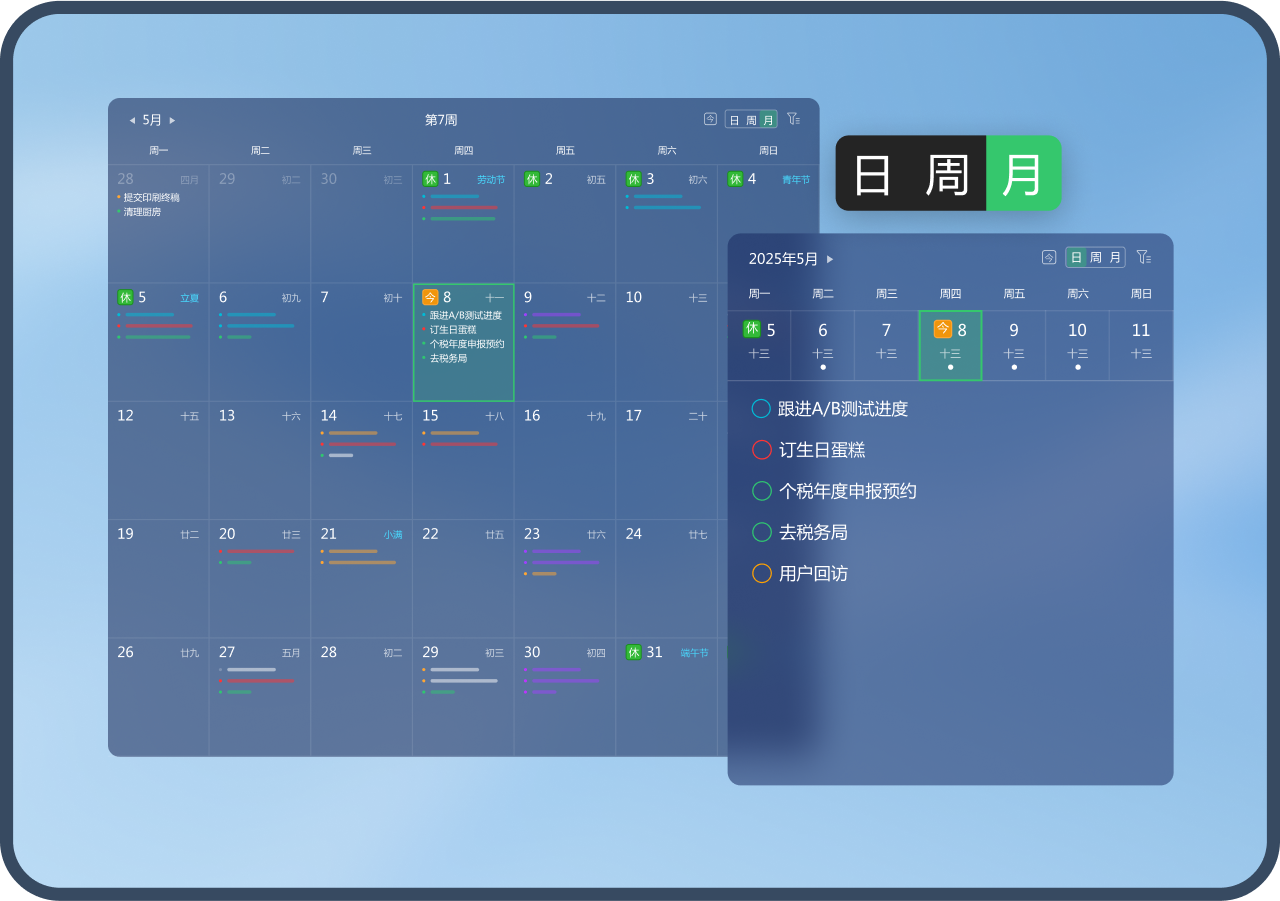 • 支持日/周/月3種日歷視圖